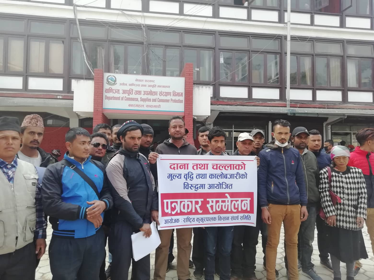 कुखुरा उत्पादन गर्न आवश्यक कच्चा पदार्थ, चल्ला र दानाको मूल्य अत्यधिक वृद्धि भएकाे भन्दै मङ्गलबार वाणिज्य, आपूर्ति तथा उपभोक्ता संरक्षण विभागमा आएर किसानले विराेध जनाए।