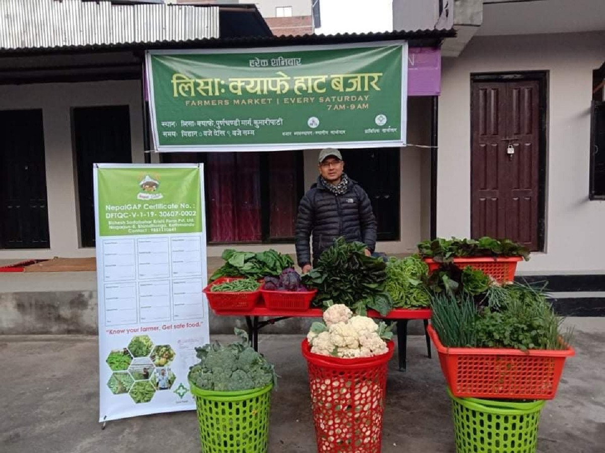पुल्चोकमा विकल्प आर्ट ग्यालरीमा नेपाल ग्यापका तरकारी पठाउन लागिएको सदावहार कृषि फार्मका सञ्चालक श्रेष्ठले बताए।