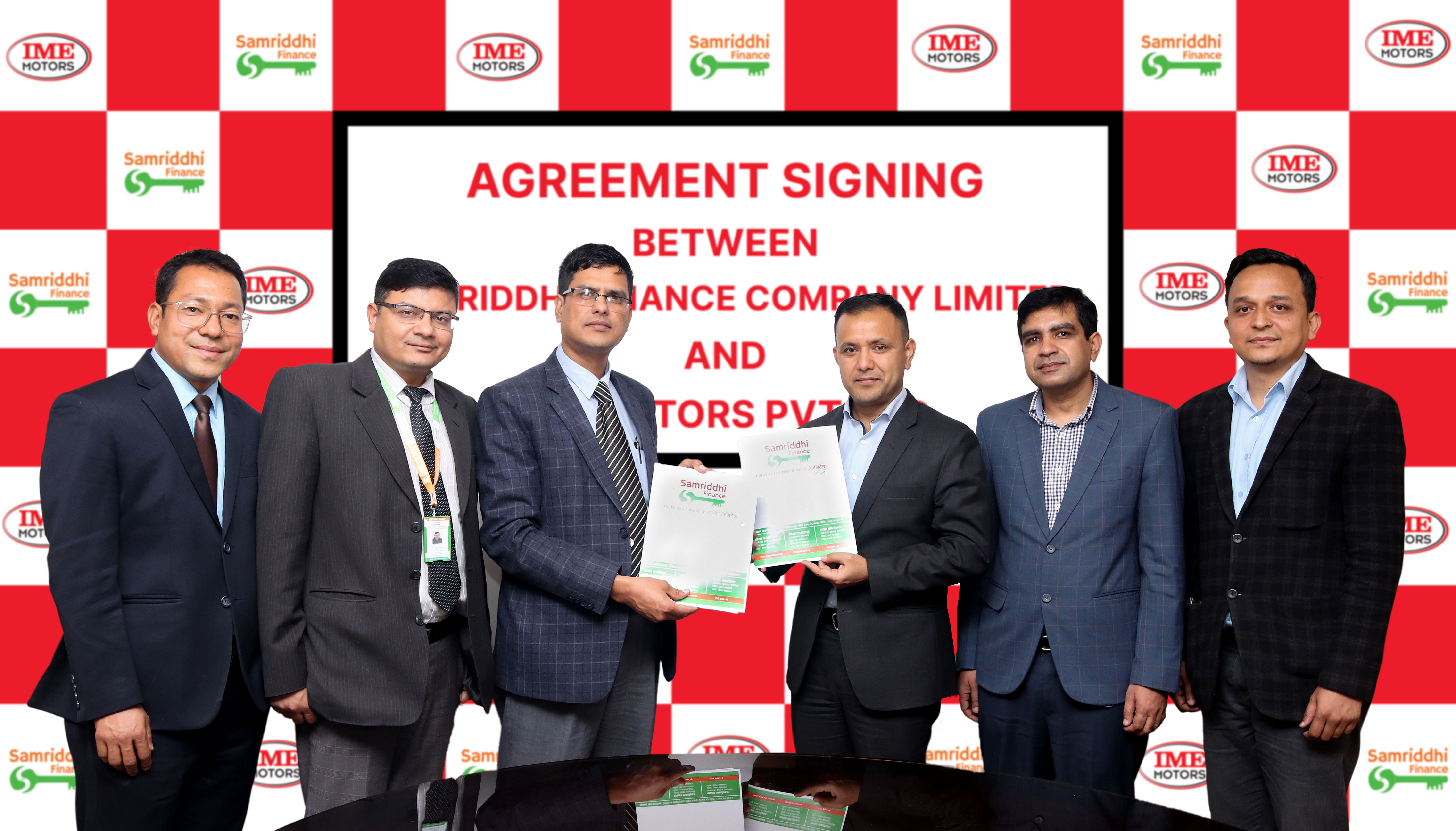 आइएमई मोटर्सको तर्फबाट कम्पनीका निर्देशक सुमन पोखरेल र समृद्धि फाइनान्सको तर्फबाट प्रमुख कार्यकारी अधिकृत टीकानिधि लोहनीले सम्झौता पत्रमा हस्ताक्षर गरेका छन्।