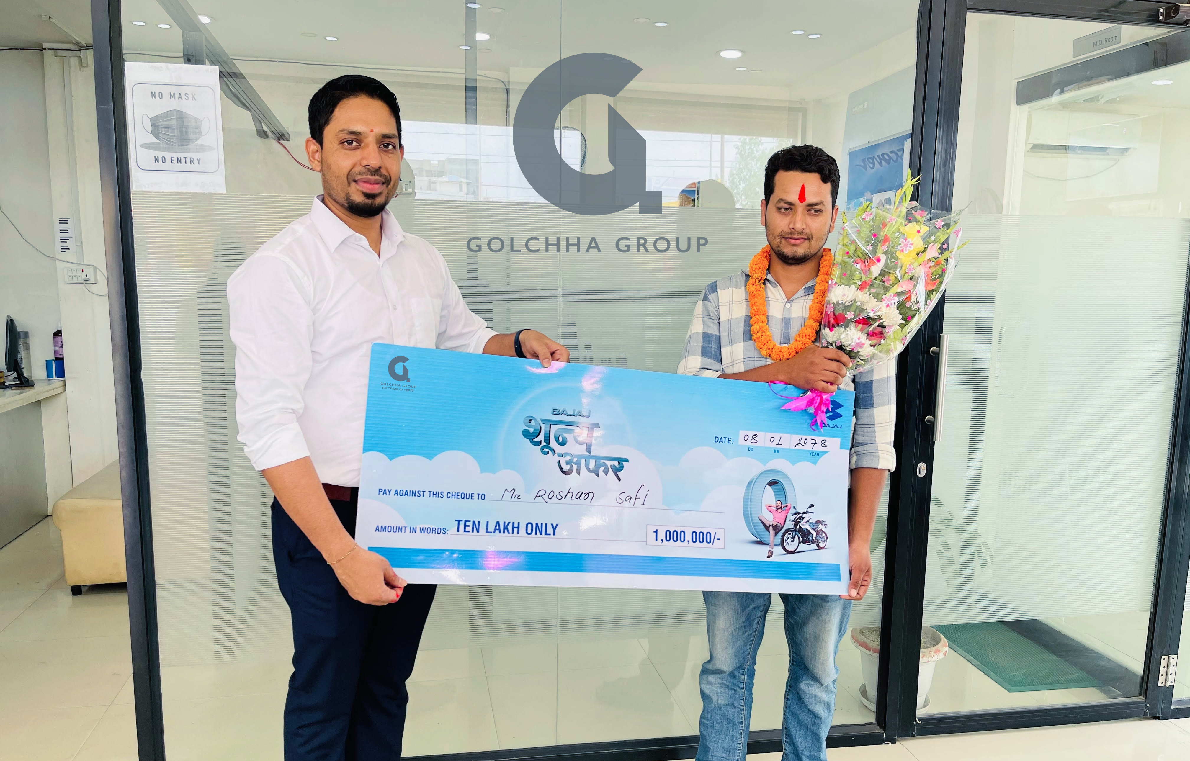 धनुषा जिल्लाका लग्मा निवासी रोसन साफिले ओम अटोमोबाइल, जनकपुरबाट बजाजको पल्सर १५० बाइक किन्दा ६ वटा शून्य प्राप्त गरेर १० लाख जित्न सफल भएका छन्।