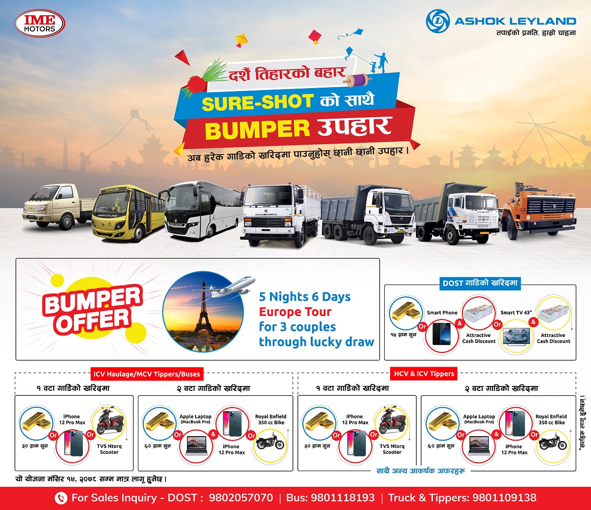 अफर अन्तर्गत अशोक लेलैण्डको दोस्त गाडीको खरिदमा १५ ग्राम सुन अथवा स्मार्ट फोन साथै थप नगद डिस्काउन्ट अथवा स्मार्ट टिभि र क्यास डिस्काउन्ट पाउन सक्नेछन्।