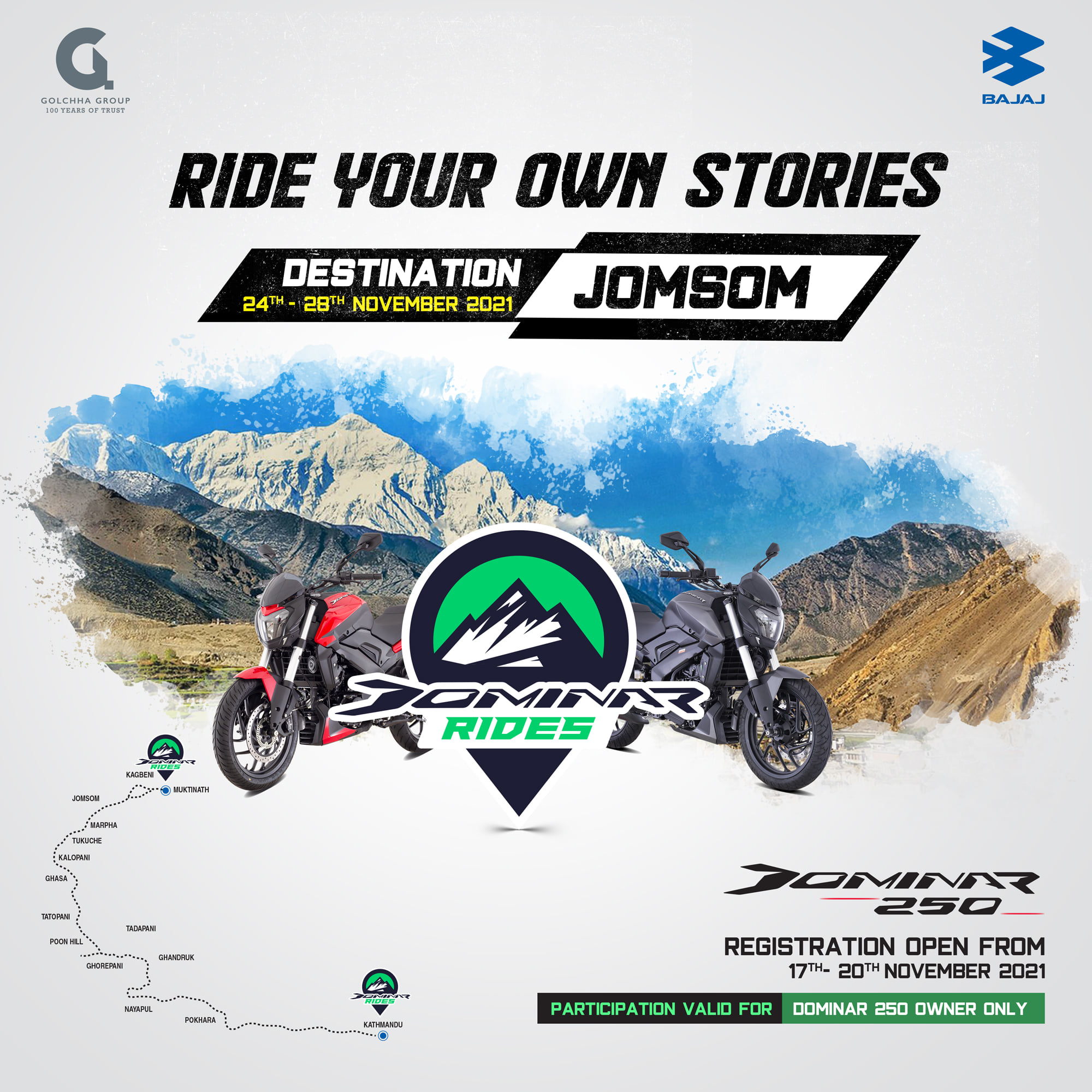 राइड योर ओन स्टोरीज्को थिममा आधारित यो राइडमा हरेक डोमिनार राइडरले डोमिनार २५० सँग जोमसोम जाँदाको रमाइलो अनुभव बटुल्न सक्नेछन्।