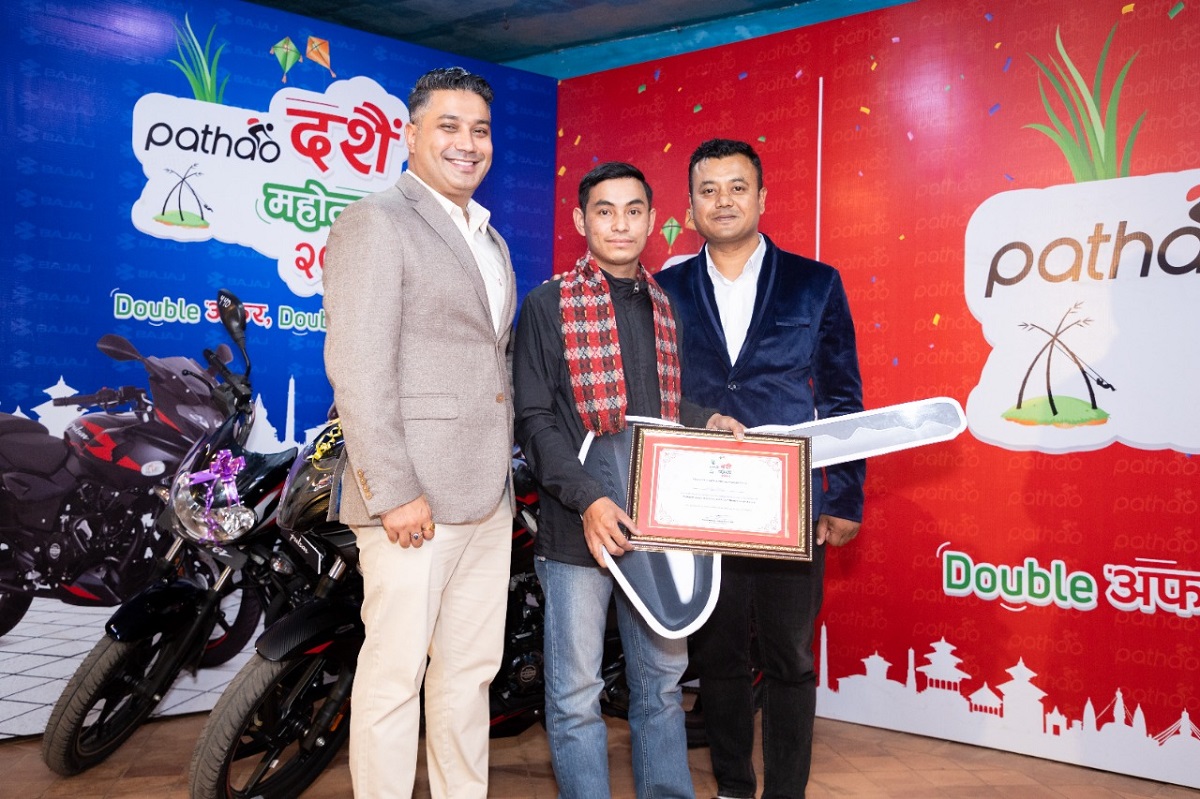राइड सेयरिङ प्लाटफर्म पठाओ नेपालका राइडर, क्याप्टेन र डेलिभरीम्यानलाई लक्षित गर्दै सञ्चालन गरिएको 'दसैं महोत्सव २०७९' अन्तर्गत दुई जनाले लक्की ड्रमार्फत बजाज डिस्कभर र पल्सर २२० बाइक जितेका छन्।