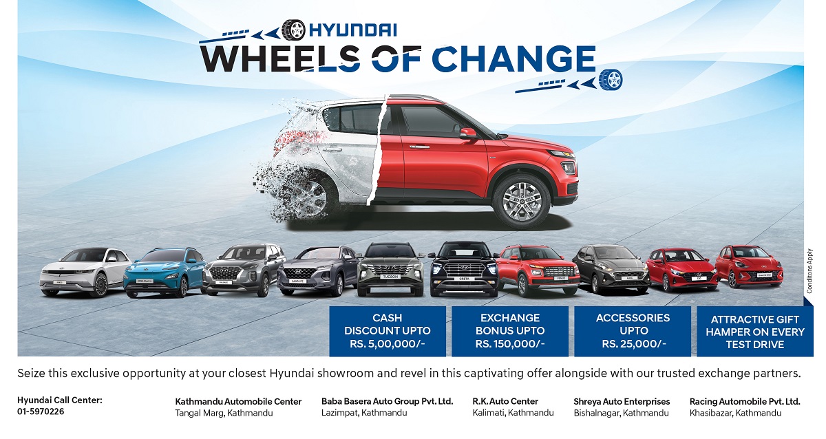 नेपालमा हुन्डाई गाडीहरूको आधिकारिक वितरक लक्ष्मी इन्टरकन्टिनेन्टल प्रालिले 'ह्विल अफ चेन्ज' नामक एक्सचेञ्ज अफर सार्वजनिक गरेको छ।
