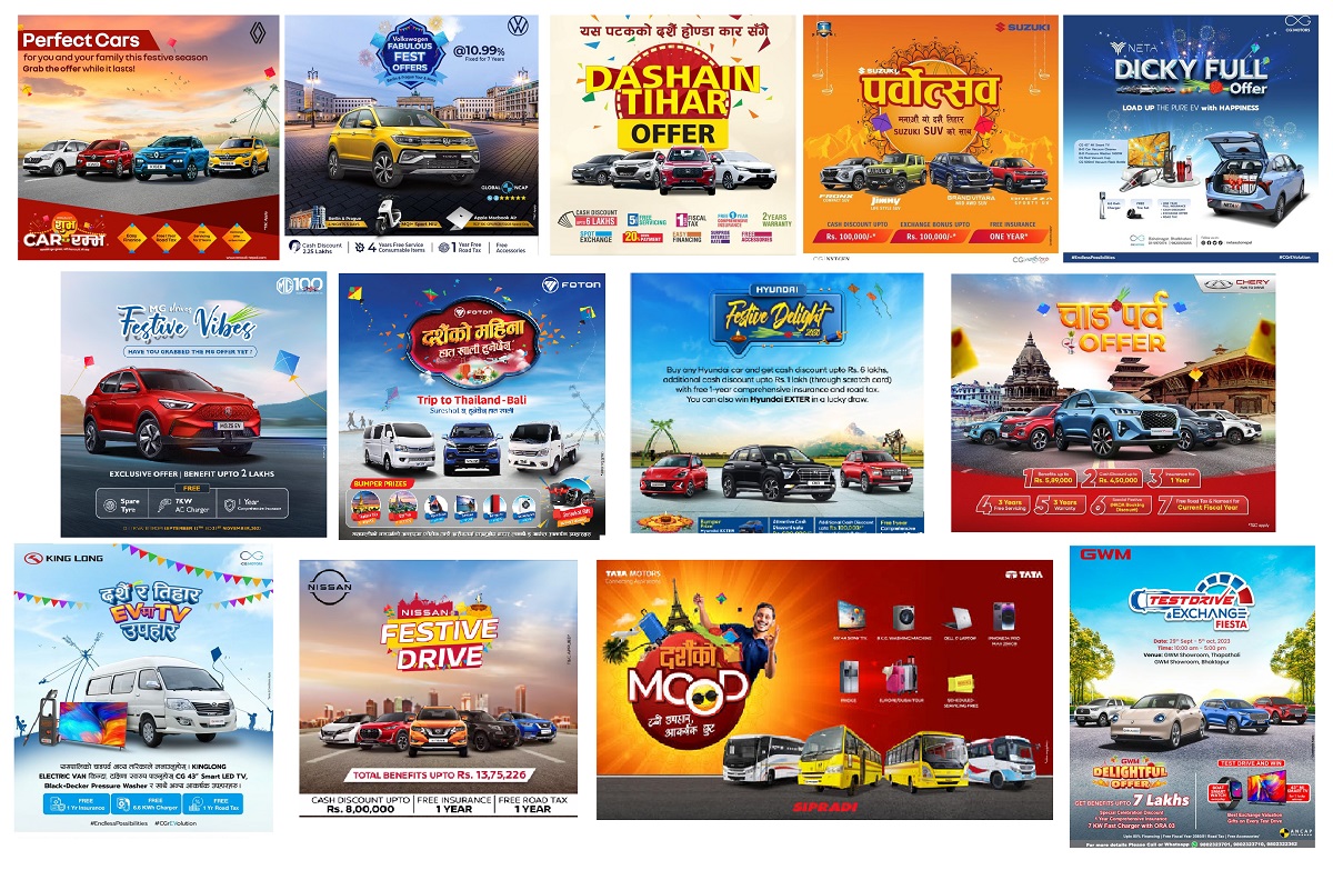 हालै सम्पन्न नाडा अटो सो २०२३ मा पनि दर्जन बढी चार पांग्रे सवारी साधन विक्रेताहरूको उपस्थिति थियो। उक्त प्रदर्शनीमा सर्वसाधारणको आकर्षण देखिएपछि पनि विक्रेताहरूले चाडपर्व लक्षित योजनाहरू सार्वजनिक गर्न थालेका छन्।
