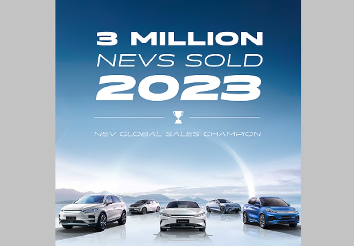 बिवाइडीले सन् २०२३ मा ३० लाखभन्दा बढीको संख्यामा विद्युतीय सवारी साधनहरू बिक्री गरेको छ।
