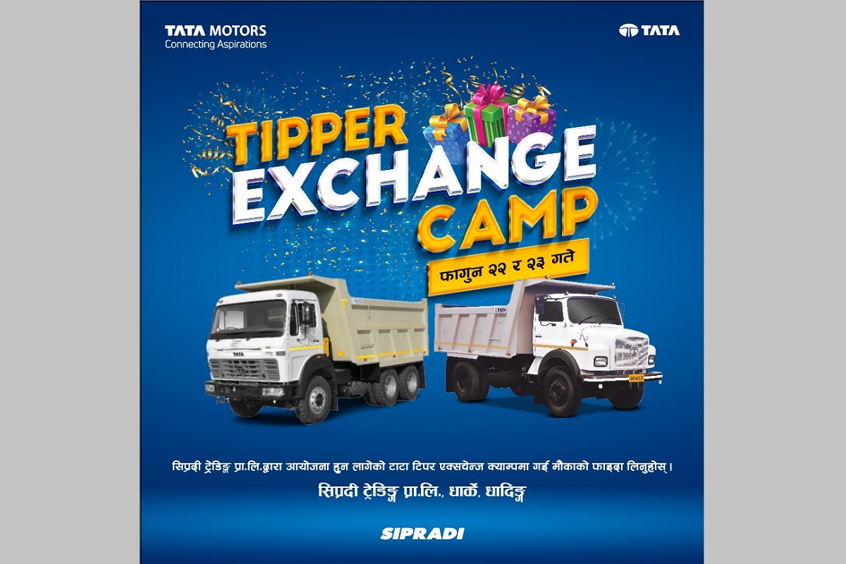 नेपालका लागि टाटा मोटर्सको एकमात्र अधिकारिक वितरक सिप्रदी ट्रेडिङले कमर्सियल गाडीहरूलाई लाक्षित गर्दै टाटा टिपर एक्सचेञ्ज क्याम्प आयोजना गर्न लागेको छ।