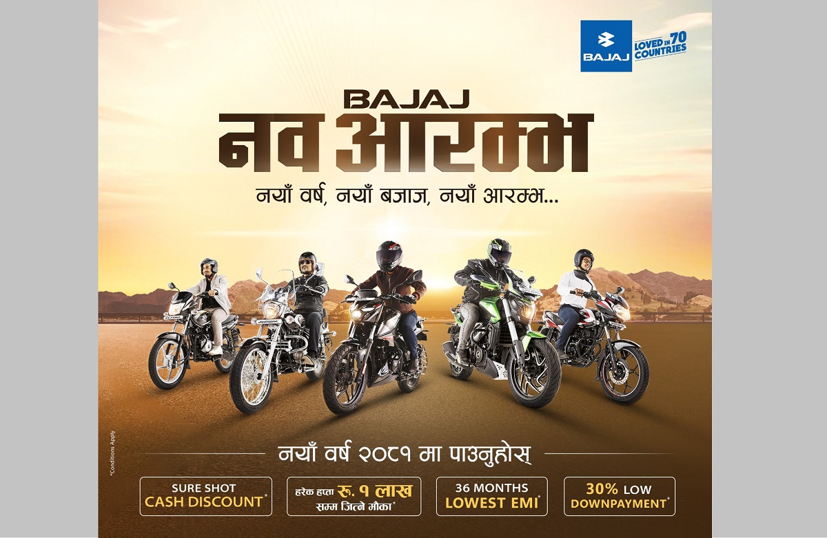 बजाजको 'नव आरम्भ' योजना अन्तर्गत ग्राहकहरूले बजाजका कुनै पनि बाइक किन्दा आकर्षक छुट पाउनेछन् भने भाग्यशाली विजेताहरूले १ लाख रूपैयाँसम्मको नगद उपहार पनि जित्न सक्नेछन्।