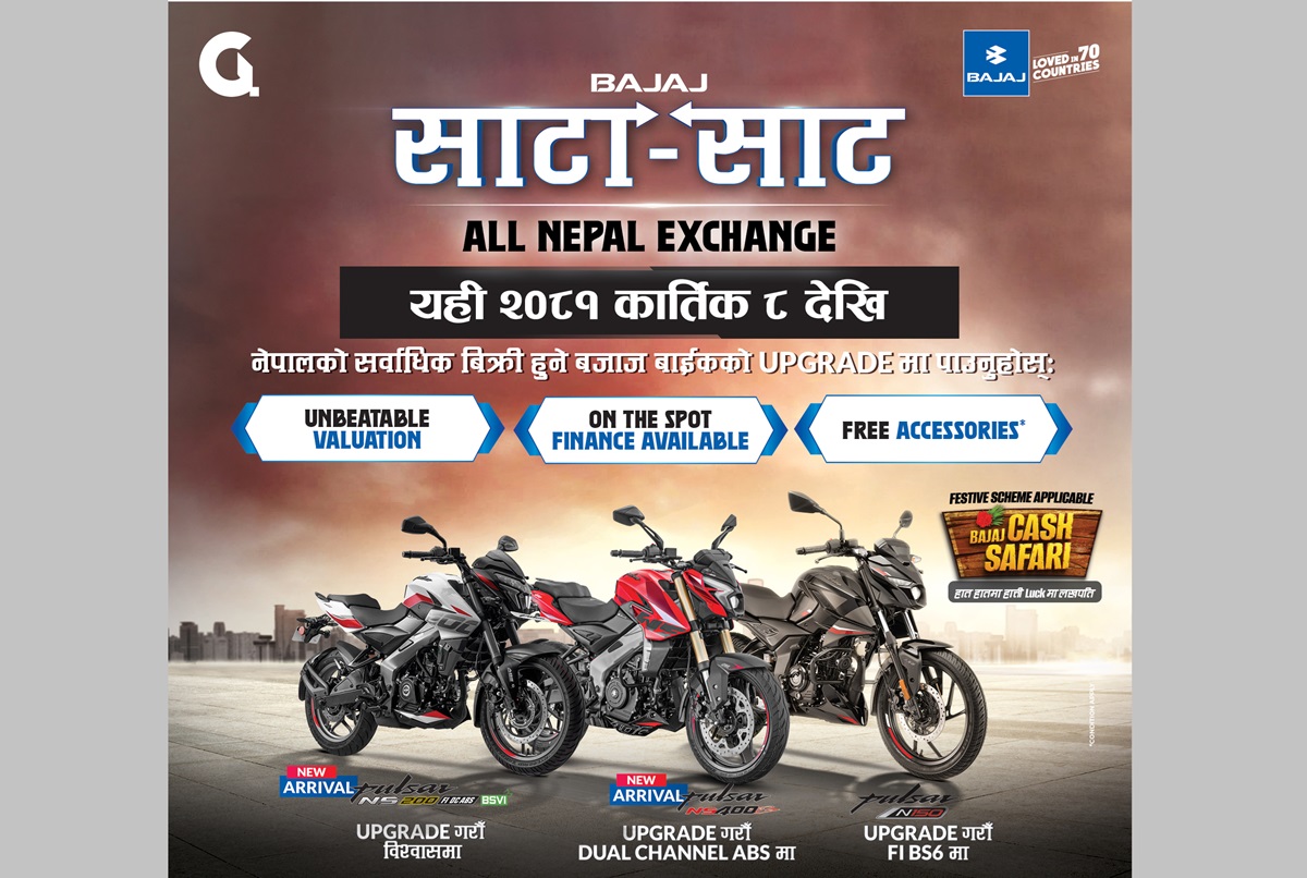 नेपालका लागि बजाज मोटरसाइकलको आधिकारिक वितरक एवं बिक्रेता हंसराज हुलास चन्द एण्ड कम्पनीले मोटरसाइकल साटा–साटको योजना सुरू गरेको छ।
