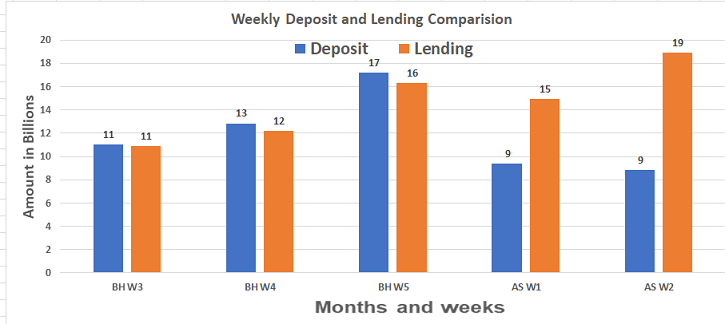 बैंकहरुमा साउन महिनामा ९ अर्ब रुपैयाँ निक्षेप घट्दा प्रवाहित कर्जा भने १५ अर्बले बढेको छ। त्यस्तै भदौमा ४१ अर्ब रुपैयाँ निक्षेप थपिएकोमा ४८ अर्ब रुपैयाँ कर्जा प्रवाह भएको छ। असोजको पहिलो १२ दिनमा १८ अर्ब रुपैयाँ निक्षेप थपिएको छ भने ३४ अर्ब कर्जा प्रवाह भएको देखिन्छ।