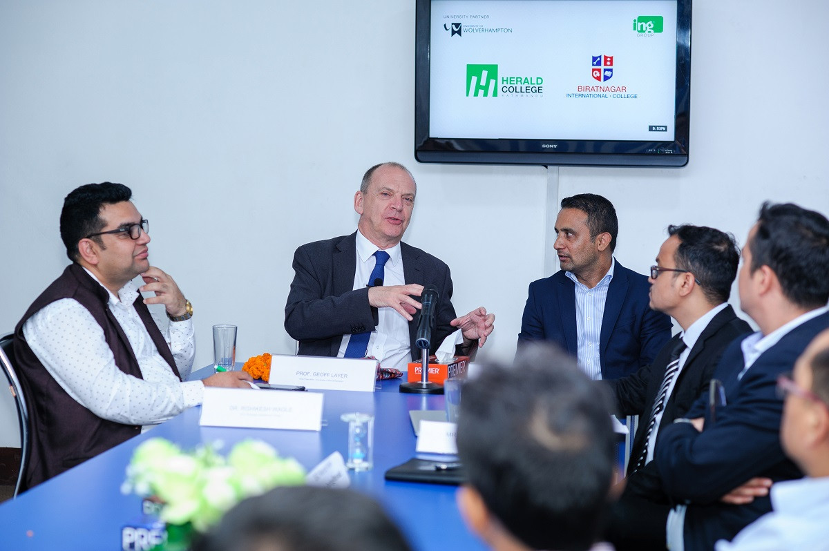 हेराल्ड कलेजको अवलोकन भ्रमणमा आएका उपकुलपति जियोफले कलेजमा आयोजित पत्रकार सम्मेलनमा बोल्दै नेपालका यी कलेजको पढाइले विश्वविद्यालयको सान बढेको धारणा राखे।