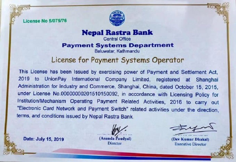 भुक्तानी सेवा प्रणाली युनियन पे इन्टरनेसनललाई राष्ट्र बैंकले सञ्चालनको अनुमति दिएको छ। चीनको सांघाईमा प्रधान कार्यालय रहेको युनियनले अब नेपालमा विद्युतीय कार्ड तथा नेटवर्क र भुक्तानी स्वीचका लागि आन्तरिक संयन्त्र विकास गर्न पाउने भएको छ।