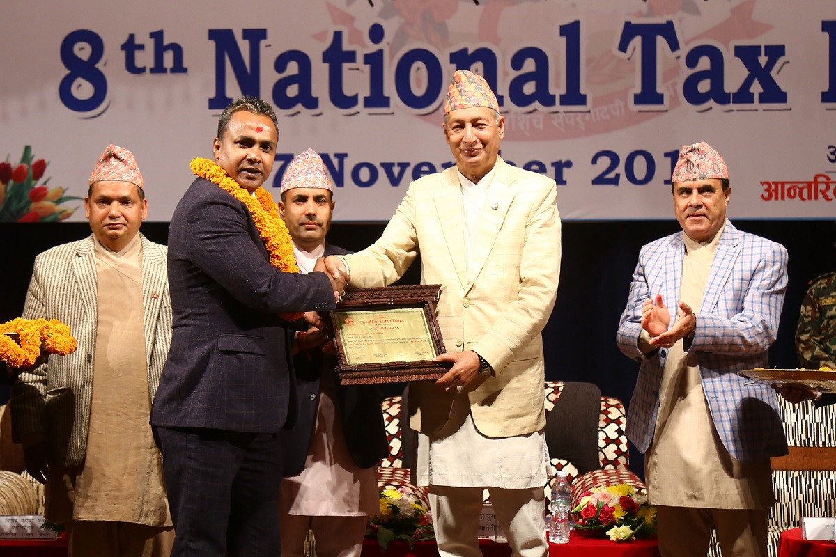 आठौं राष्ट्रिय कर दिवस २०७६ को अवसरमा आज मंसिर १ गते काठमाडौंमा आयोजित कार्यक्रममा अर्थमन्त्री डा. युवराज खतिवडाले नेपाल लाइफ इन्स्योरेन्स कम्पनीका प्रमुख कार्यकारी अधिकृत विवेक झालाई सम्मानपत्र प्रदान गरेका थिए।