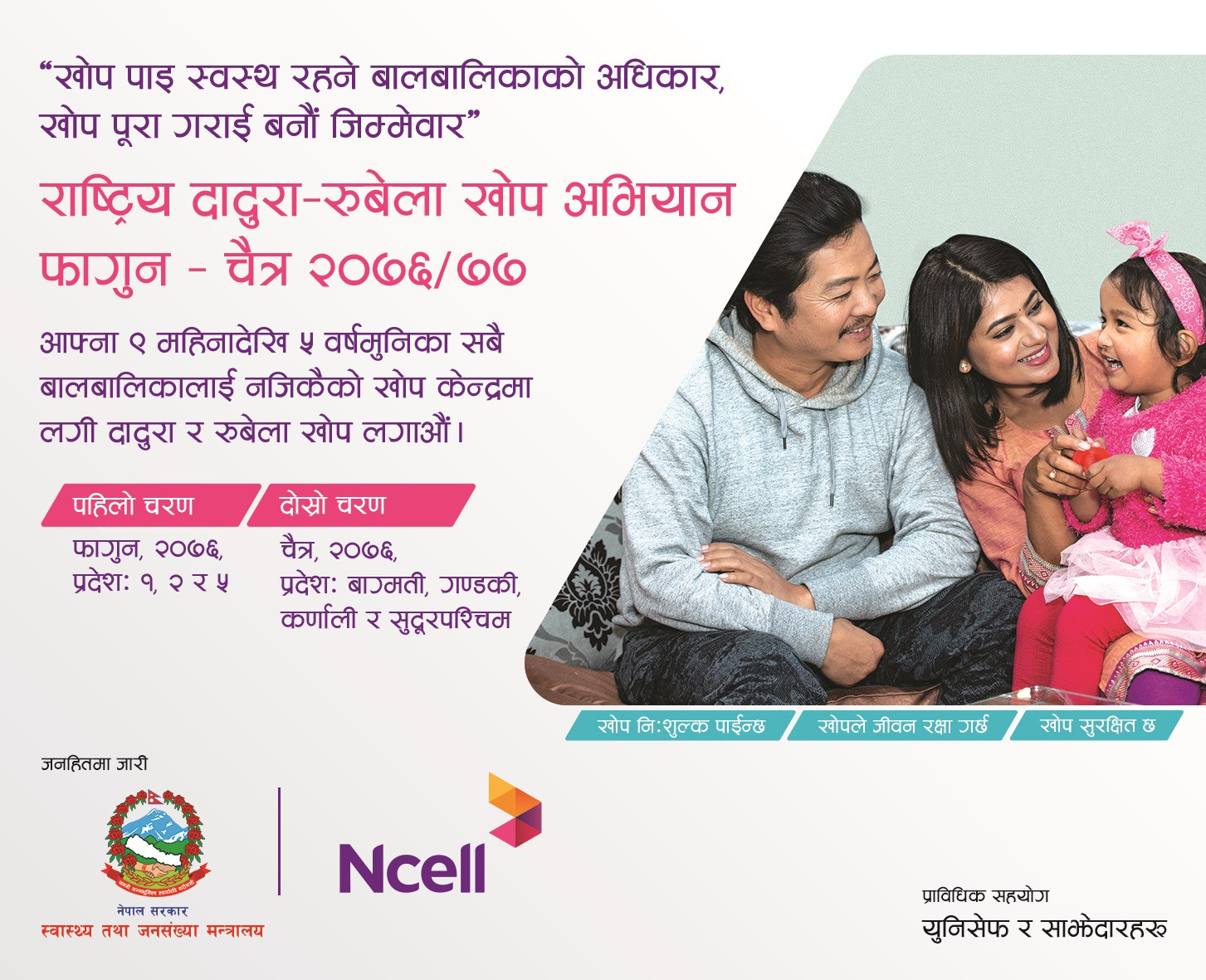 एनसेल प्राइभेट लिमिटेडले स्वास्थ्य तथा जनसंख्या मन्त्रालय र युनिसेफसँग सरकारको राष्ट्रिय दादुरा–रुबेला अभियानमा सहकार्य गरेको छ।