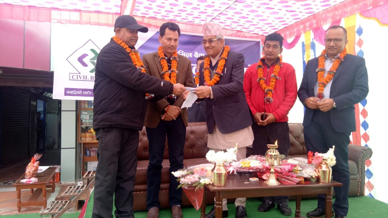 एक कार्यक्रमकाबीच सिभिल बैंकका संचालक समितिका सदस्य भिमानन्द ढुंगाना तथा सुनवल नगरपालिकाका मेयर भिम बहादुर थापाले संयुक्त रुपमा उक्त शाखाको उद्धघाटन गरे।