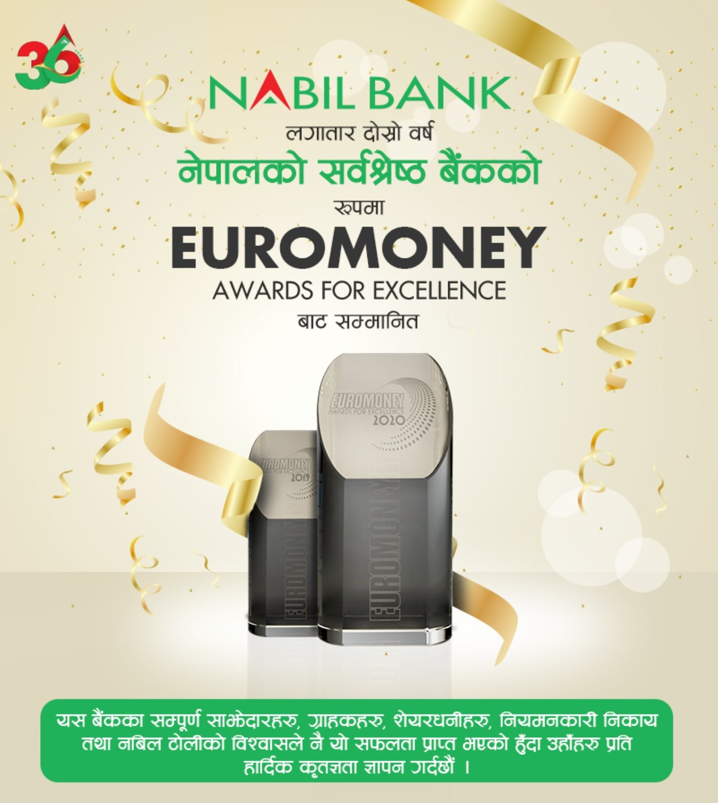 बेलायतको प्रतिष्ठित प्रत्रिका यूरोमनीले लगातार दोस्रोपटक पनि नबिल बैंक लिमिटेडलाई ‘नेपालको उत्कृष्ट बैंक’ घाेषित गरी पुरस्कार प्रदान गरेकाे छ।