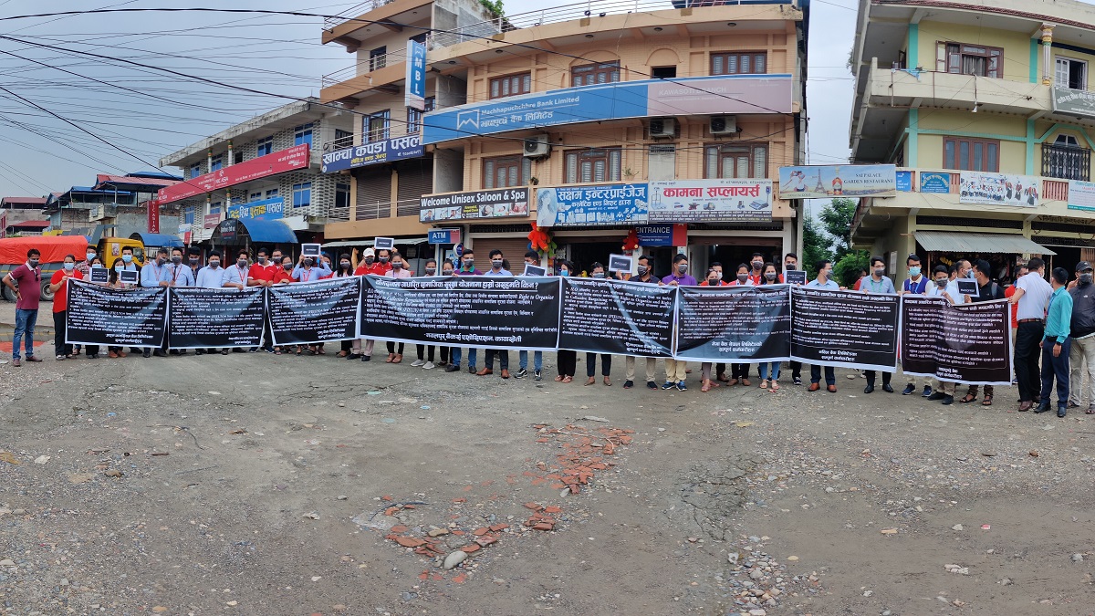 बैंक तथा वित्तिय संस्थाहरुले सामाजिक सुरक्षा कोषमा आवद्ध हुन नसक्ने बुँदाहरु सहितको ब्यानर प्रदर्शन गरि संयुक्त रुपमा विरोध गरेका हुन् ।