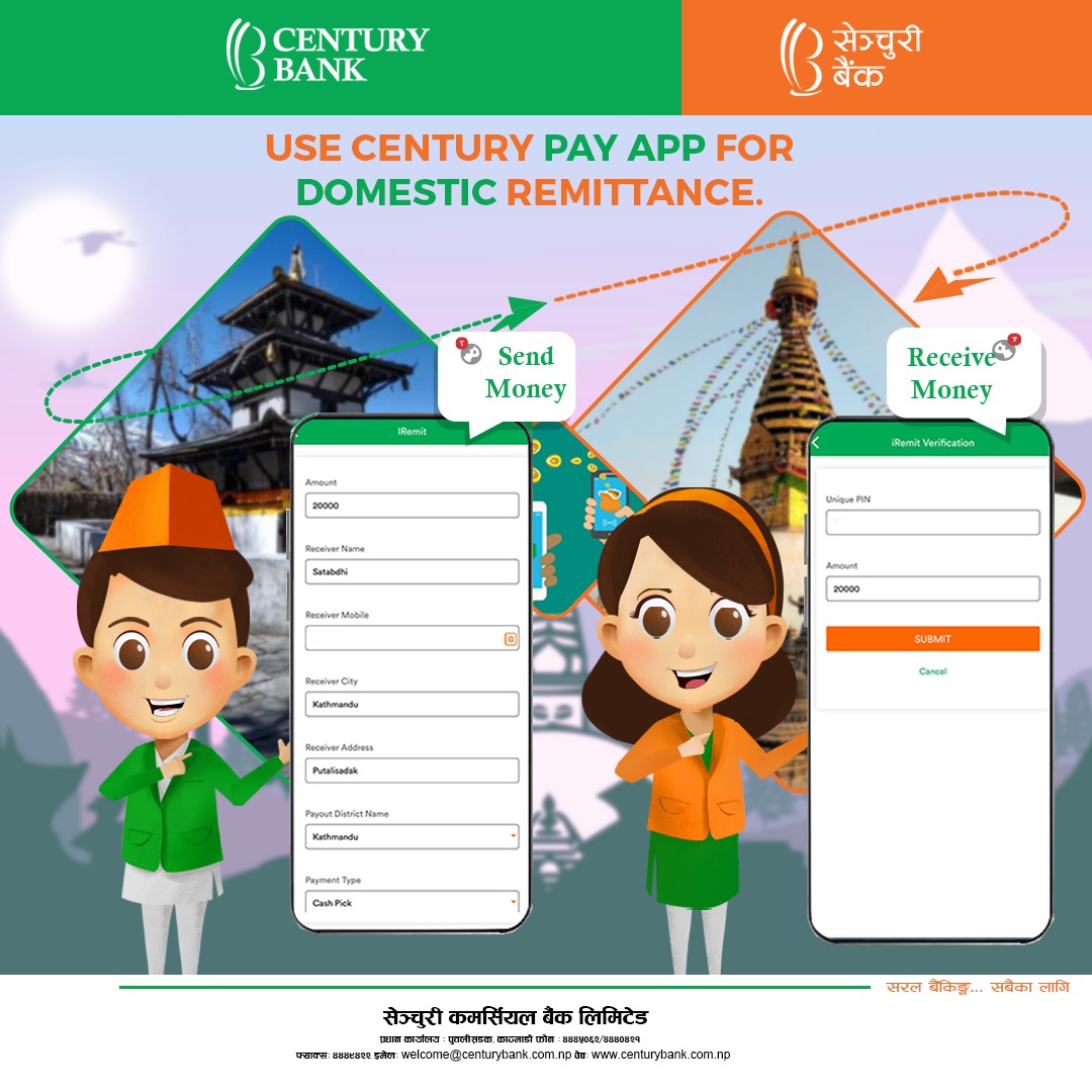 सेञ्चुरी कमर्सियल बैंकले ग्राहकको सुबिधालाई ध्यानमा राख्दै मोबाईल बैंकिङ एप सेञ्चुरी पेबाट अनलाईन आन्तरिक रेमिट्यान्स सेवा पनि प्रदान गर्ने भएको छ।
