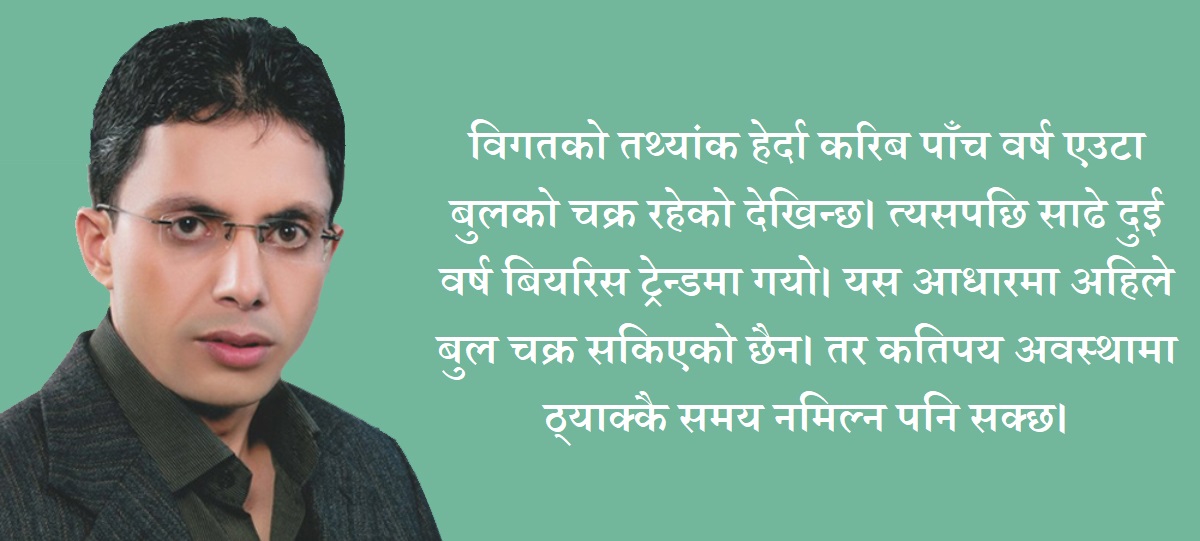 बजार विश्लेषण गर्दा विगतका घटनाक्रमलाई पनि आधार मान्नु पर्छ। कतिपय घटनाक्रम दोहोरिँदै जान्छन् पनि। विगतको तथ्यांक हेर्ने हो भने करिब पाँच वर्ष अवधिसम्म एउटा बुलको चक्र रहेको देखिन्छ। २०६० सालदेखि २०६५ सम्म एउटा बुलको चक्र देखियो। त्यसपछि साढे दुई वर्ष बजार बियरिस ट्रेन्डमा गयो।