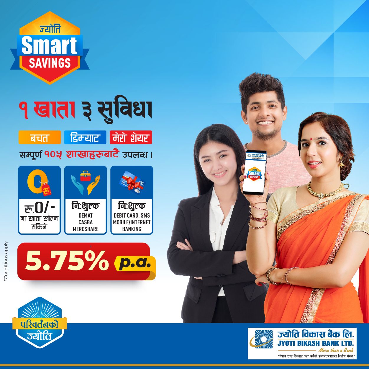 ज्योति विकास बैंकले शुन्य मौज्दातमा बचत, निस्शुल्क डिम्याट र निस्शुल्क मेरो सेयर गरी एउटै खातामा ३ सुविधा भएको ज्योति स्मार्ट सेभिङ्ग्स बचत खाता ल्याएको छ। जसमा सर्वाधिक ५.७५ प्रतिशत ब्याजदर निर्धारण गरेको छ।