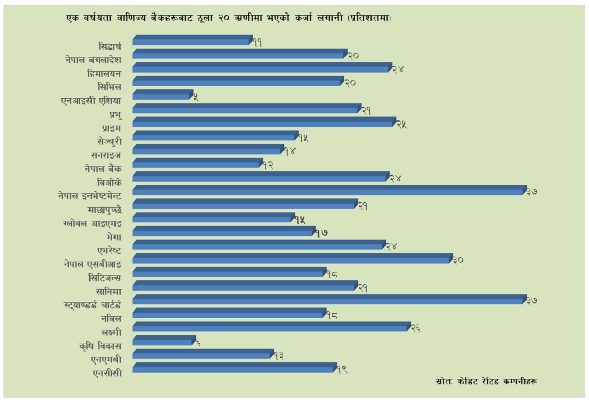 अझैपनि वाणिज्य बैंकहरूबाट जारी हुने कर्जाको २० प्रतिशत बराबर कर्जा २० ठूला ऋणीले पाइरहेका छन्। विगत एक वर्षयता विभिन्न समयमा क्रेडिट रेटिङ (साख मूल्यांकन) गराएका २५ वाणिज्य बैंकहरूले कुल कर्जाको औसत २० प्रतिशत बराबर कर्जा लगानी ठूला २० ऋणीहरूमा गरिरहेका छन्। ऋणीको संख्या नदोहोरिएको मान्ने हो भनेपनि यी २५ वाणिज्य बैंकहरू हरेकमा रहेका २० ठूला ऋणीहरू जोड्दा ५ सय जना मात्रै हुन्छन्।