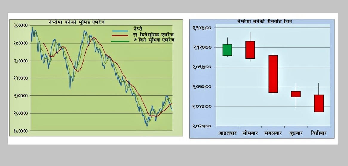 नेप्सेको रेखाचित्रमा बनाइएको ७ दिने र २१ दिने मुभिङ एभरेज विश्लेषणको आधारमा भने बजार वियरिश (घट्दो) प्रवृत्तिमा प्रवेश गर्न लागेको जस्तो देखिएको छ।