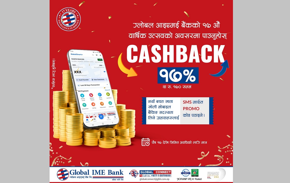 ग्लोबल आइएमई बैंकले आफ्नो १७औं वार्षिकोत्सवको अवसरमा कार्ड तथा मोबाइल बैंकिङमार्फत् गरिने कारोबारहरूमा १७ प्रतिशतसम्म छुट तथा एक हजाररूपैयाँसम्म क्यास ब्याक प्रदान गर्ने योजना सार्वजनिक गरेको छ।