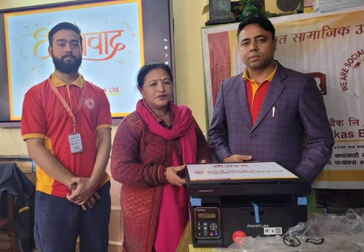 न्यूरोड शाखाका प्रमुख कुमार अधिकारीले विद्यालयका प्रधानाध्यापक हिरा मर्हजनलाई प्रिन्टर हस्तान्तरण गरेका हुन्।