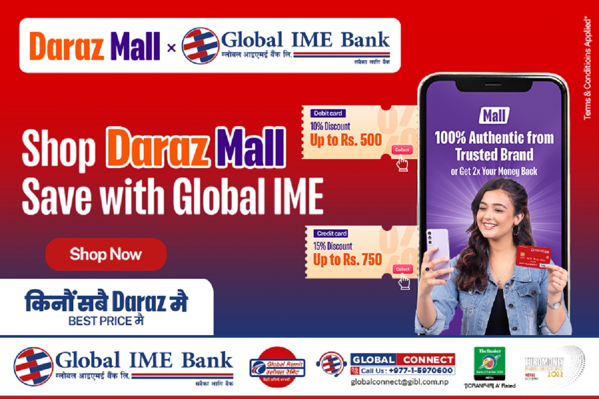 ग्लोबल आइएमई बैंकका कार्ड बाहक ग्राहकहरूलाई दराजबाट (डिमल खण्ड) अनलाइनमार्फत् सामान किन्दा १५ प्रतिशतसम्म छुट पाउने योजना सार्वजनिक भएको छ।
