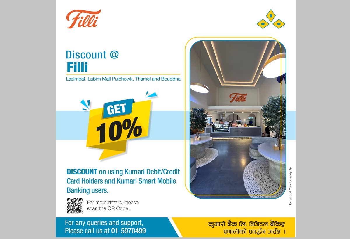 सम्झौता अनुसार कुमारी बैंकका ग्राहकहरूले फिलीका लाजिम्पाट, लबिम मल पुल्चोक, ठमेल र बैद्धिस्थित शाखाहरूबाट सेवा लिए बापत गर्नुपर्ने कुनै पनि भुक्तानी कुमारी बैंकको डेबिट/क्रेडिट कार्ड अथवा क्युआरद्वारा गर्दा १० प्रतिशत छुट प्राप्त गर्न सक्नेछन्।