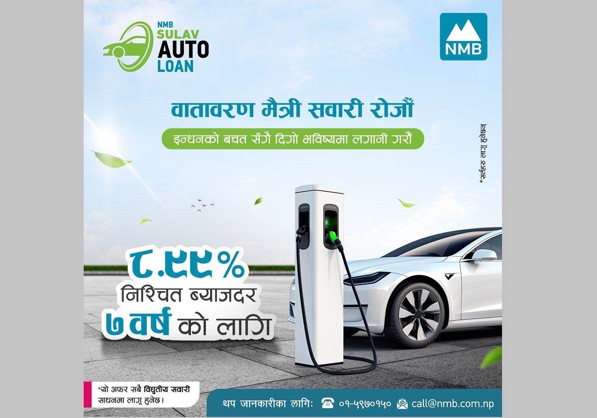 एनएमबी बैंकले विद्युतीय सवारीसाधनहरू ७ वर्षको अवधिका लागि मात्र ८.९९ प्रतिशत निश्चित ब्याजदरमा उपलब्ध गराएको छ।