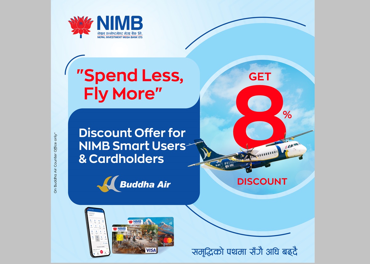 नेपाल इन्भेष्टमेण्ट मेगा बैंक (एनआइएमबी) लिमिटेड र बुद्ध एयरबीच भएको सम्झौतामा एनआइएमबीका ग्राहकहरू साथै उनीहरूको परिवार (बुबा, आमा, श्रीमती, छोरा/छोरी) लाई बुद्ध एयरको हवाई टिकट खरिद गर्दा ८ प्रतिशत छुट दिने भएको छ।