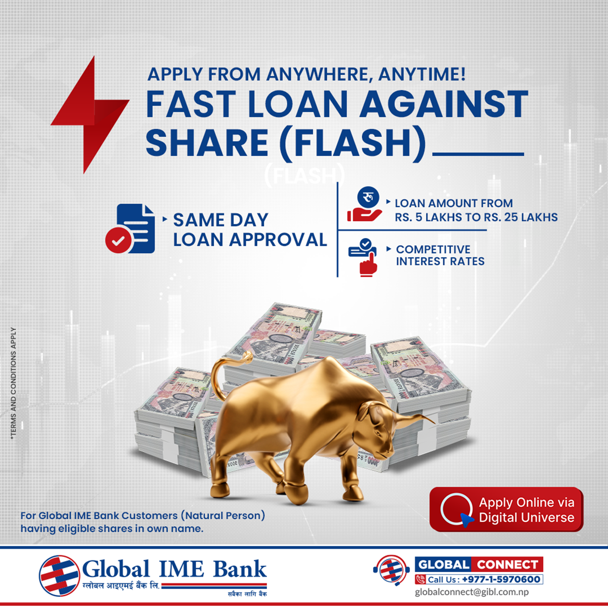 ग्लोबल आइएमई बैंकले फास्ट लोन अगेन्स्ट शेयर प्लेटफर्म सार्वजनिक गरेको छ। यसअन्तर्गत इच्छुक ग्राहकले अनलाइनबाट सेयर धितो कर्जाको लागि आवेदन दिन सक्नेछन्।