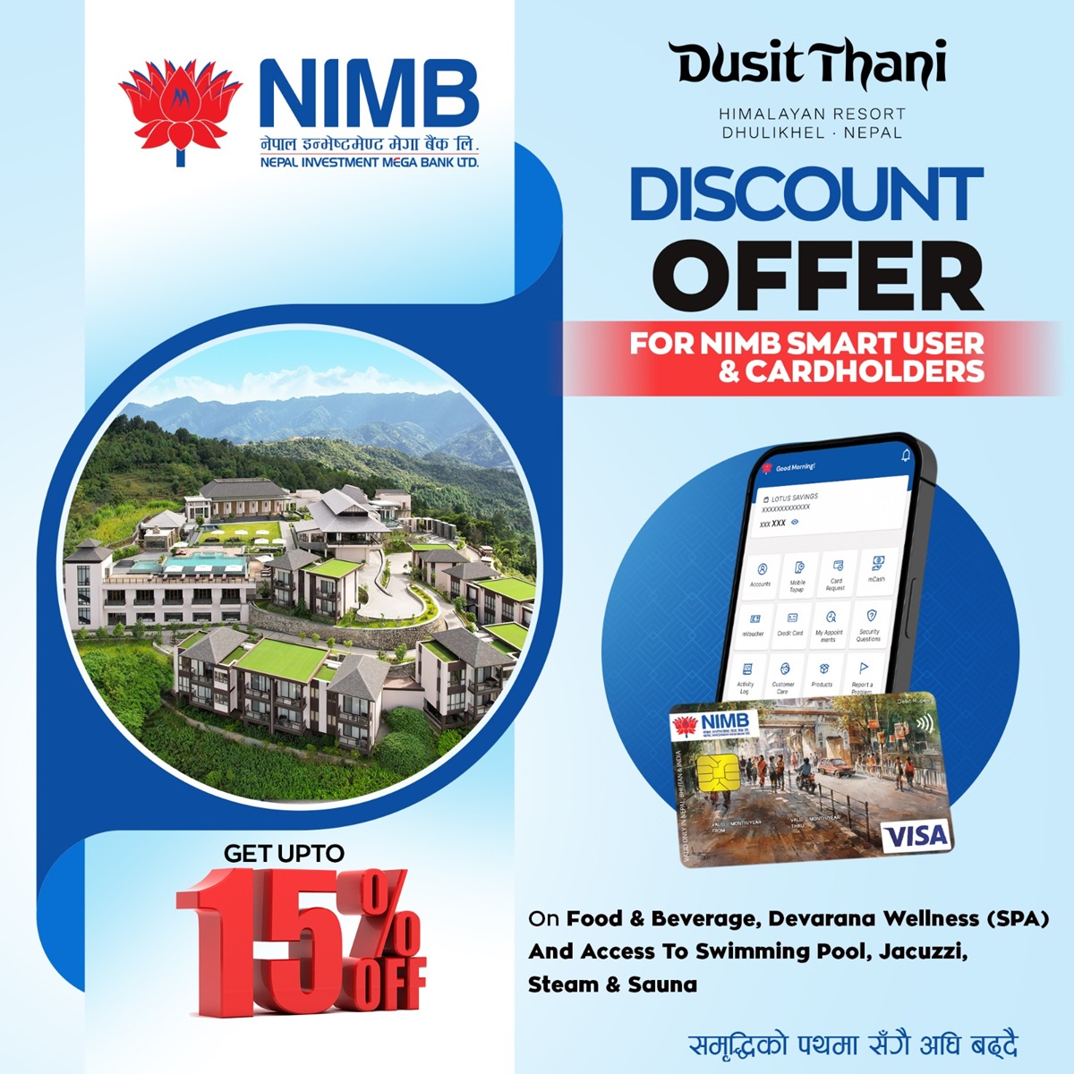 एनआईएमबी बैंक र दुसित थानी हिमालयन रिसोर्ट, धुलिखेल बीच भएको सम्झौतामा एनआईएमबीका ग्राहकहरुले छुट पाउने भएका हुन्।सम्झौता अनुसार फुड एण्ड बेवरेज र स्पा सर्भिसमा १५प्रतिशतसम्म छुट दिने भएको छ।