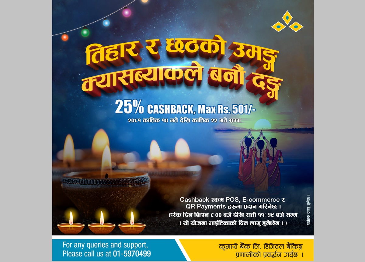 कुमारी बैंकले आगामी तिहार, किजा पूजा तथा छठ पर्वका अवसरमा सेवाग्राहीहरूलाई शुभकामना स्वरुप तिहार तथा छठ क्यासब्याक अफर सञ्चालनमा ल्याएको छ।