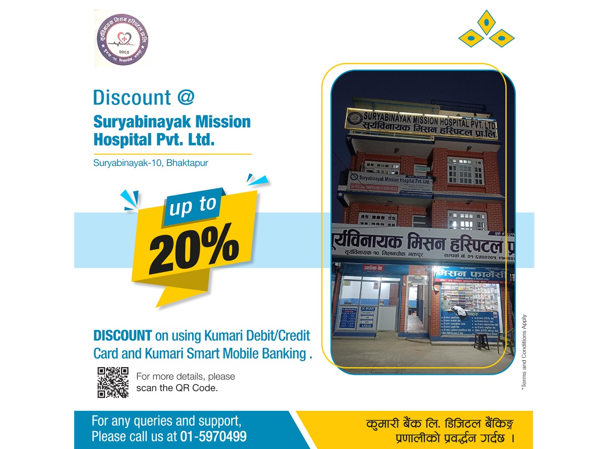 कुमारी बैंक र भक्तपुरस्थित सूर्यविनायक मिसन हस्पिटलबीच कुमारी बैंकका ग्राहकहरूलाई हस्पिटलबाट प्रदान गरिने विभिन्न सेवाहरूमा विशेष छुट प्रदान गर्ने सम्झौता भएको छ।