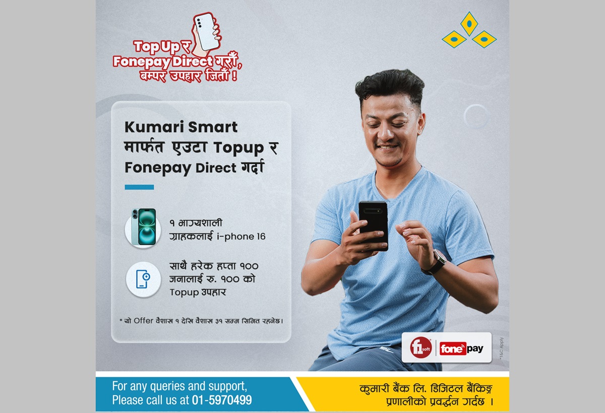 कुमारी बैंकले नयाँ योजना 'टपअप र फोन पे डाइरेक्ट गरौँ, बम्पर उपहार जितौँ!' सार्वजनिक गरेको छ।