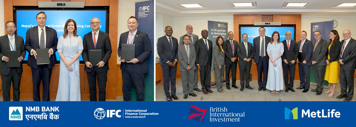 एनएमबी बैंकद्वारा अन्तर्राष्ट्रिय निकायहरू आइएफसी, बिआइआई र मेट लाइफसँगको साझेदारीमा नेपालमै पहिलो पटक अमेरिकी डलर ६ करोड बराबरको नेपाली रूपैयाँ अंकित हरित बण्ड जारी गर्ने उद्देश्यका साथ साझेदारी पत्रमा हस्ताक्षर भएको छ।