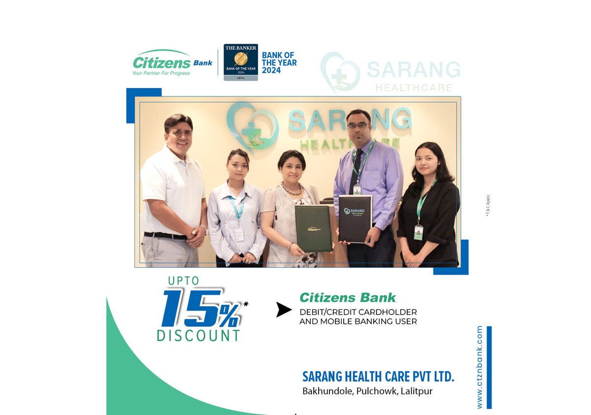सिटिजन्स बैंक इन्टरनेसनल र ललितपुरस्थित सारंग हेल्थ केयरबीच सिटिजन्स बैंकका ग्राहकहरूलाई विशेष छुट दिने समझदारी पत्रमा हस्ताक्षर भएको छ।