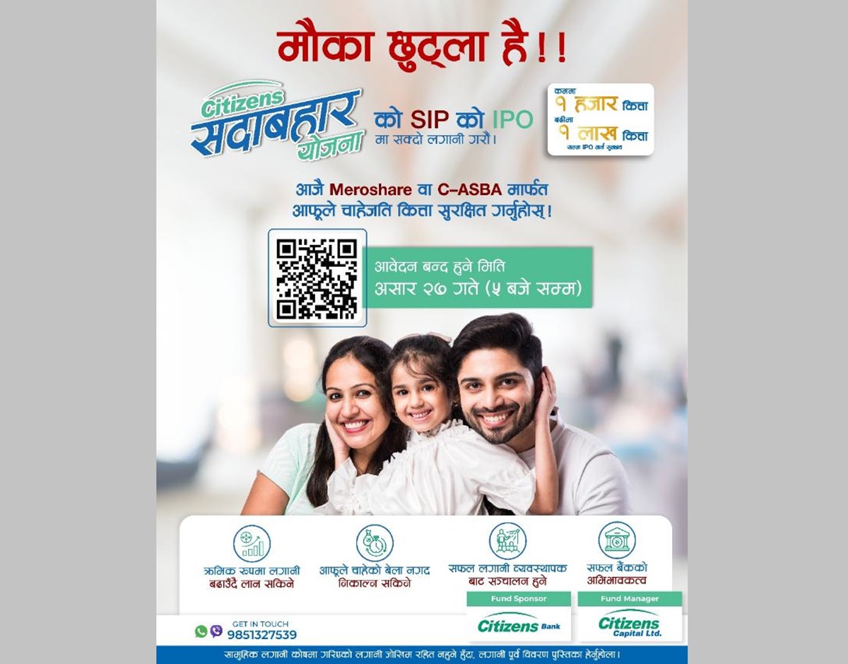 सिटिजन्स क्यापिटलले असार १३ गतेदेखि सामूहिक लगानी कोष सिटिजन्स सदाबहार योजनाको इकाई सार्वजनिक निष्कासनमा ल्याएको छ।