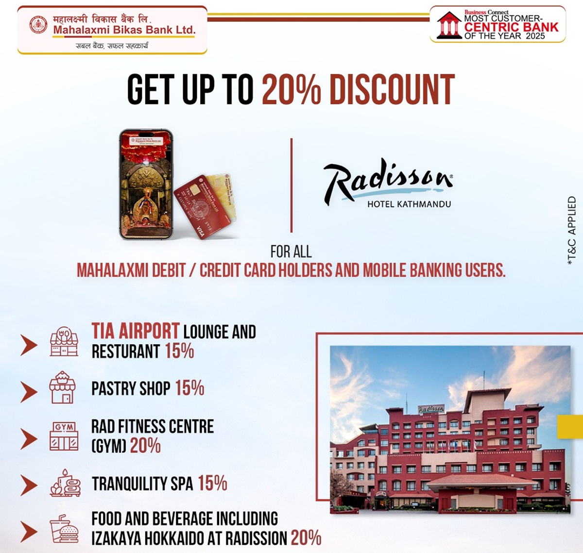 महालक्ष्मी विकास बैंकले र्याडिसन एयरपोर्ट लाउन्जमा छुट दिने भएको छ।