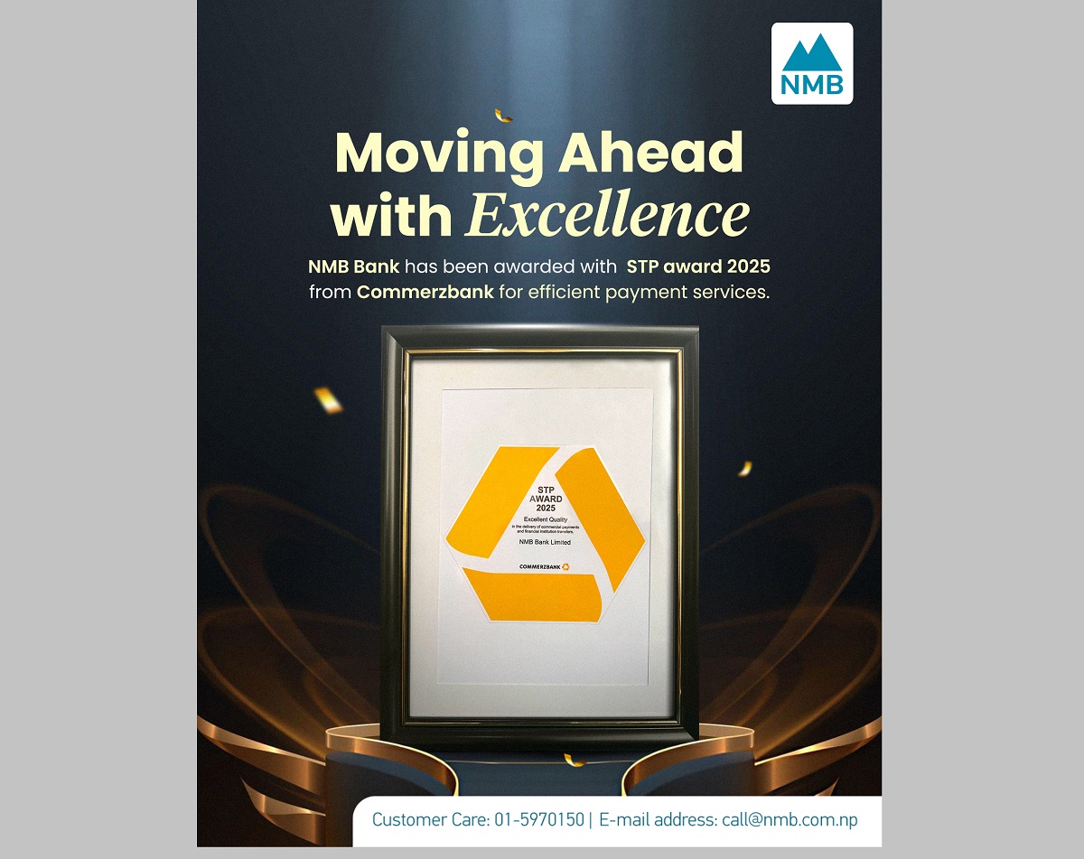एनएमबी बैंकले व्यावसायिक भुक्तानी तथा वित्तीय संस्था स्थानान्तरणमा उत्कृष्ट गुणस्तर र दक्षता प्रदर्शन गरेबापत कमर्ज बैंक एजी, जर्मनीबाट प्रतिष्ठित 'एसटिपी अवार्ड २०२५' प्राप्त गरेको छ।