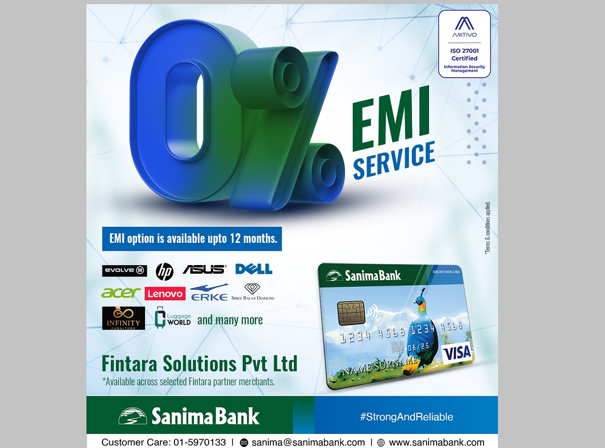 सानिमा बैंकले क्रेडिट कार्ड प्रयोगकर्ताहरूका लागि सहज र आकर्षक शून्य प्रतिशत ब्याजमा इएमआई सुविधा प्रधान गर्ने उद्देश्यले फिनतारा सोलुसन्ससँग सहकार्य गरेको छ।