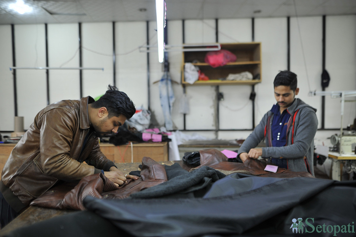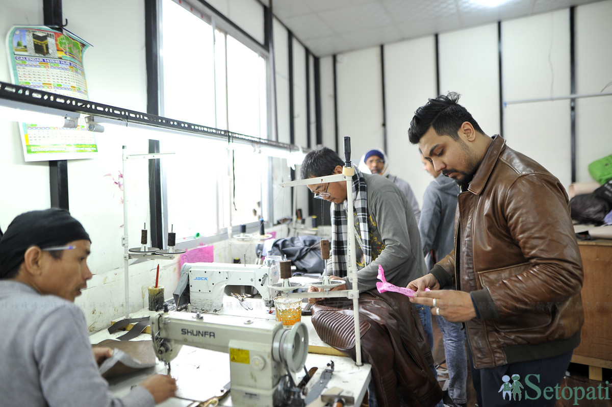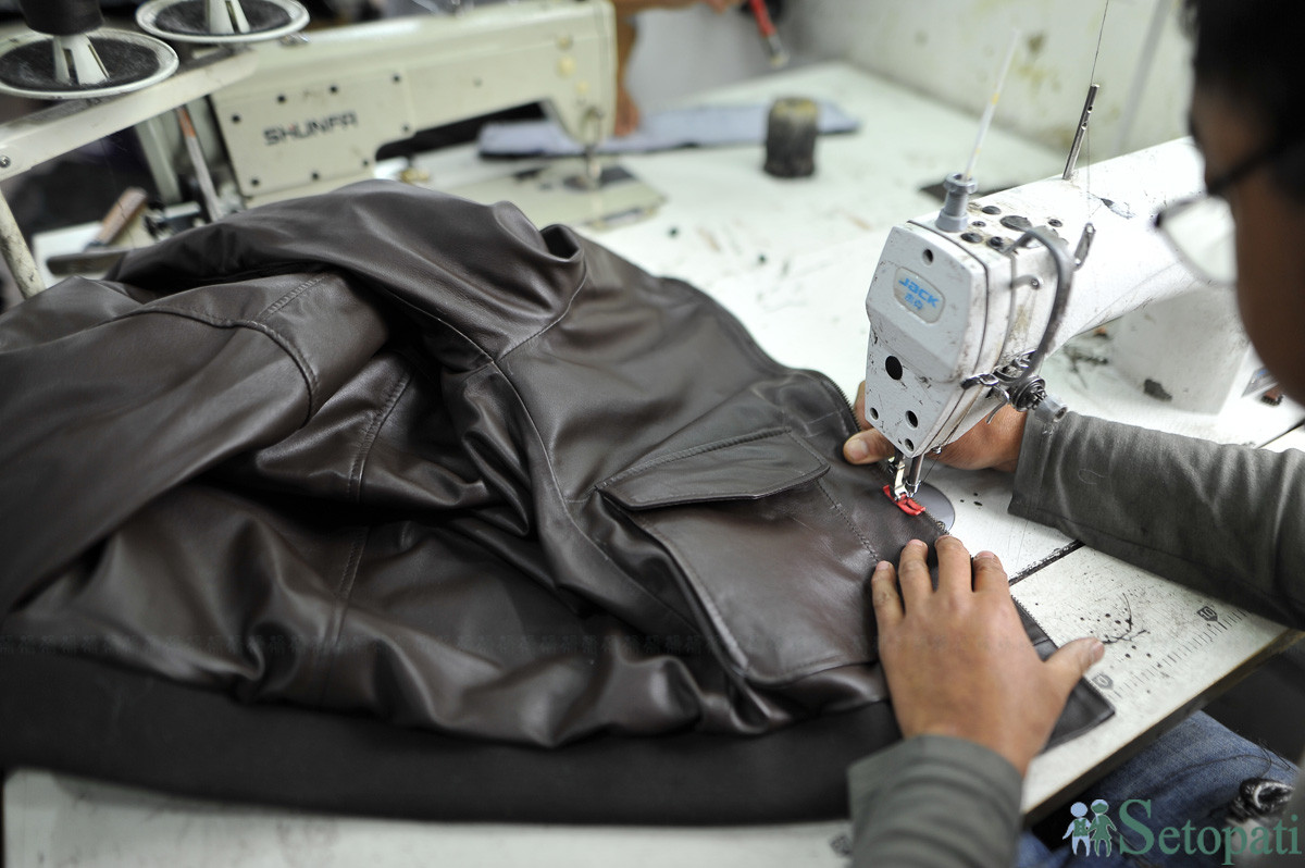 ल्याटिडोमा बन्दै गरेको छालाको ज्याकेट। तस्बिरः नारायण महर्जन/सेतोपाटी
