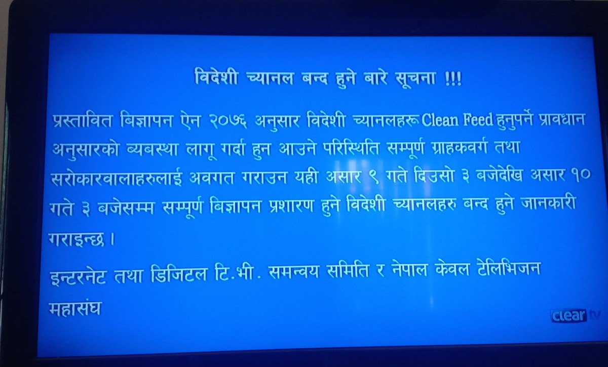 टेलिभिजन सेवाप्रदायकहरूले 'क्लिन फिडको विरोधमा' च्यानल बन्द गरेको उल्लेख गरेका छन्। विदेशी च्यानलमा विदेशी विज्ञापन प्रसारण गर्न नपाइने जुन व्यवस्था लागू गर्न खोजिएको छ, यसैलाई 'क्लिन फिड' भनिन्छ।