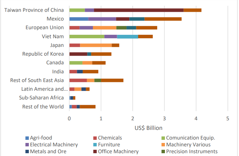 अनट्याडका अनुसार ताइवानले योबीचमा ४ अर्ब २० करोड अमेरिकी डलरले अमेरिकामा निर्यात बढाएको छ। सन् २०१९ को पहिलो ६ महिनाको तथ्यांकमा आधारित यो अध्ययनअनुसार ताइवानले मसिनरी र सञ्चार साधन निर्यात बढाएको हो।