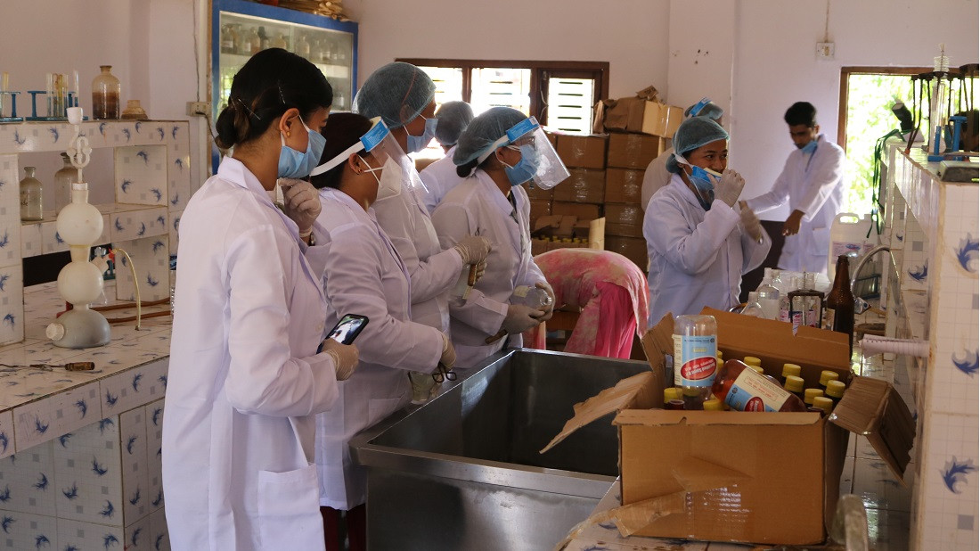 तुलसीपुरकी महिला उद्यमी ज्ञानुमाया भण्डारीलाई स्यानिटाइजर बनाउन भ्याइनभ्याई छ।