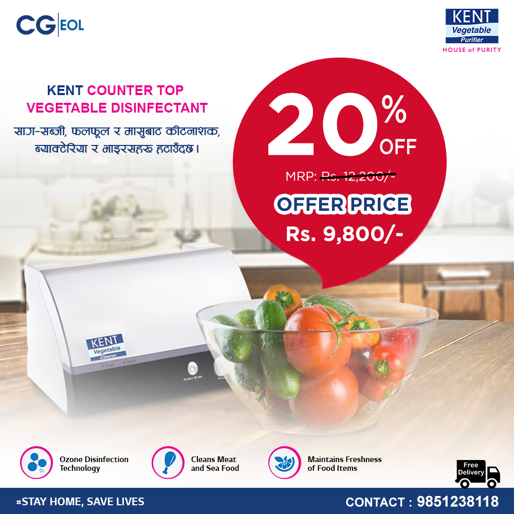 सि. जी. इलेक्ट्रोनिक्स अन्तर्गतको संस्थाले 'केन्ट काउन्टर टप भेजिटेबल कीटाणुनाशक उपकरण'मा २० प्रतिशत छुट दिइने भएकाे छ।