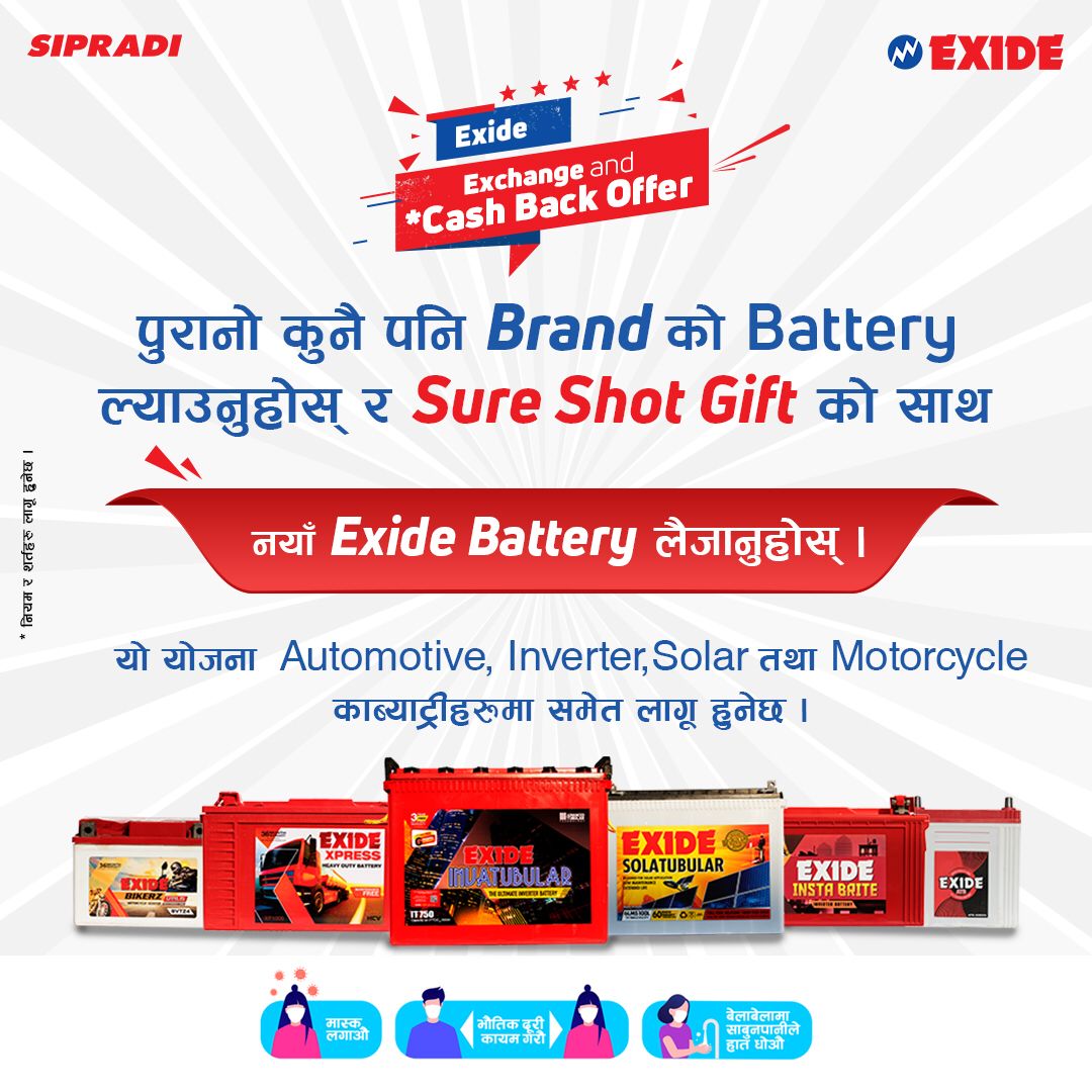 नेपालको लागि एक्साइड ब्याट्रीको आधिकारिक बिक्रेता सिप्रदी ट्रेडिङले हालै चाडपर्वको अवसरमा एक्साइड क्यास ब्याक अफर ल्याएको छ ।