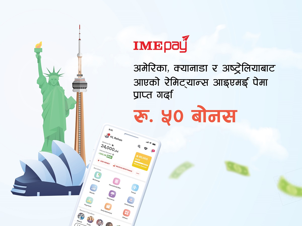 आइएमई डिजिटल सोलुसन लिमिटेडले 'आइएमई पे' मा अमेरिका, क्यानाडा र अष्ट्रेलियाबाट आएको रकम प्राप्त गर्दा ग्राहकलाई दिइने ५० रुपैयाँ बोनसलाई निरन्तरता दिने भएको छ।